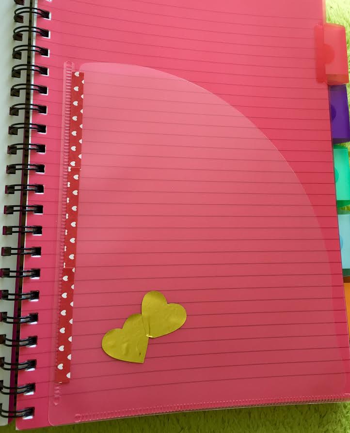 Zošit, ktorý som si kúpila, má krásny, ružový, plastový obal. Kedže som nechcela lepiť obrázky či rôzne dekorácie na povrchovú vrstvu, svoj DIY projekt som presunula na prvú stranu pod plastom.